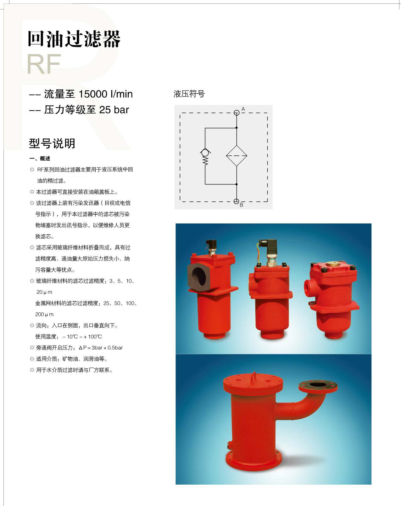 RF系列回油過濾器主要用于液壓系統(tǒng)中回油的精過濾。我公司生產(chǎn)的國產(chǎn)賀德克過濾器可替代原廠使用,如需原廠產(chǎn)品請聯(lián)系賀德克代理或經(jīng)銷商!