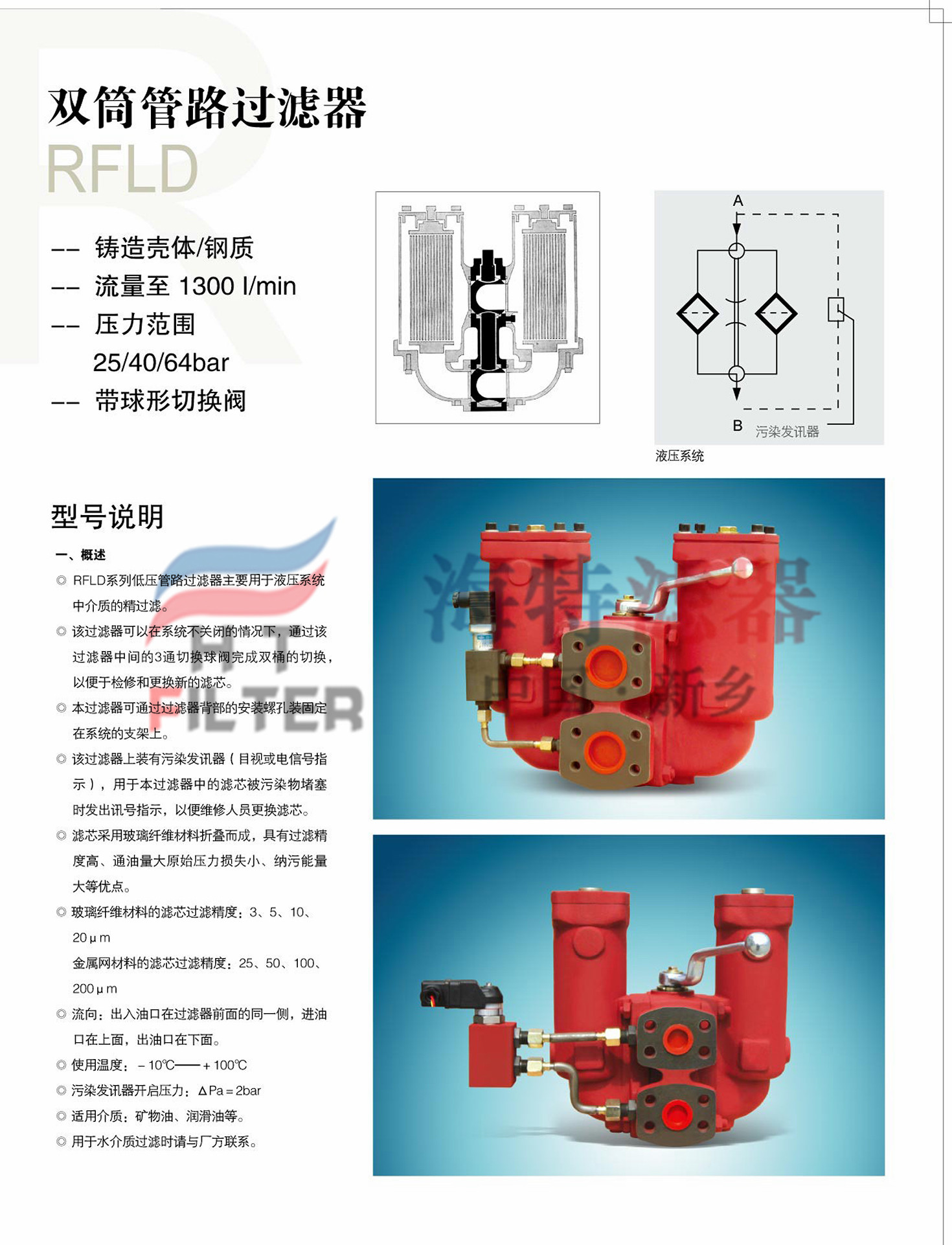 RFLD鑄造式雙筒管路過濾器,國產(chǎn)賀德克過濾器,非原廠產(chǎn)品,需要原廠產(chǎn)品請聯(lián)系賀德克代理經(jīng)銷商!我司生產(chǎn)的替代RFLD雙筒過濾器和原廠產(chǎn)品尺寸規(guī)格一致...